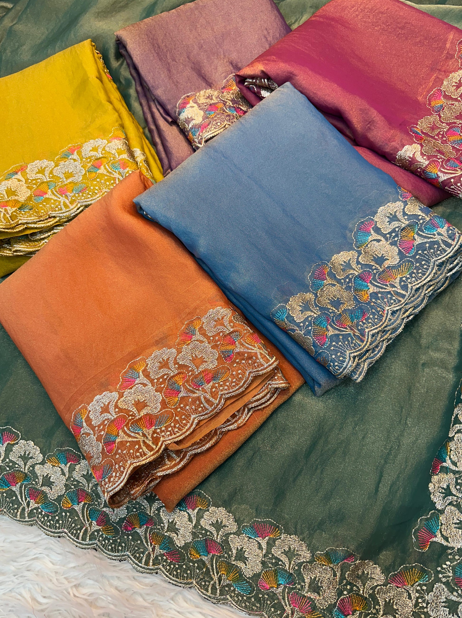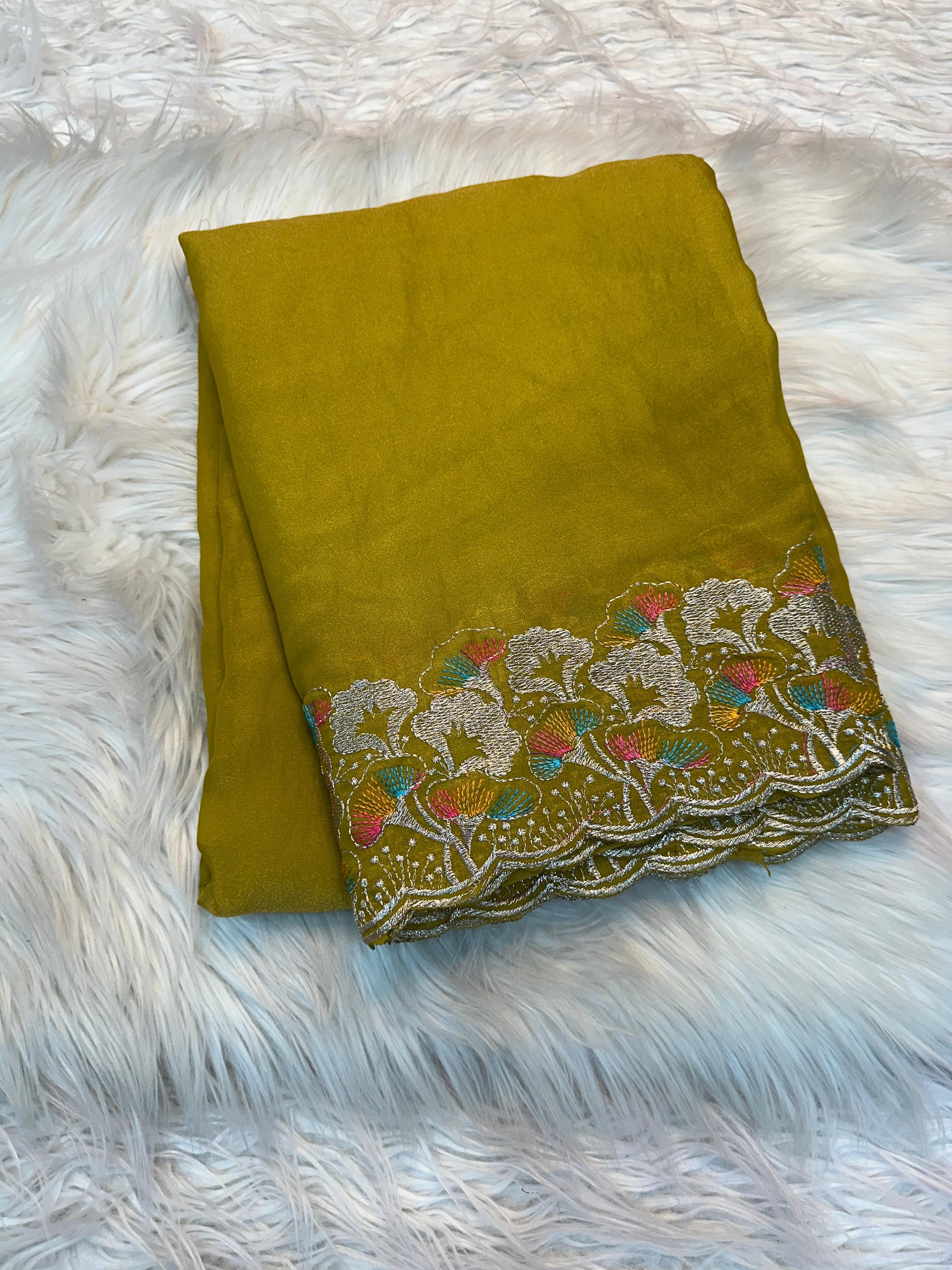Designer Mustard Yellow Moss Silk Saree with Multicolor Embroidery Border & Contrast Blouse