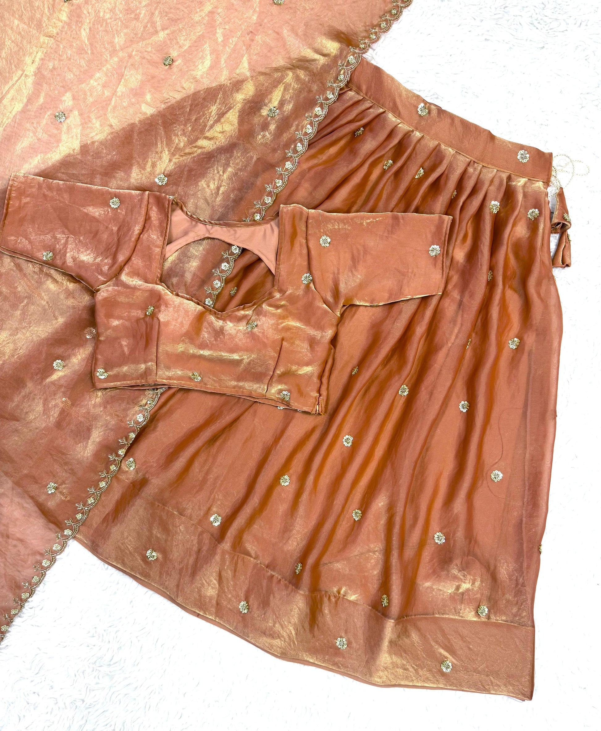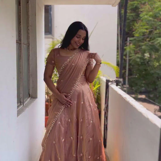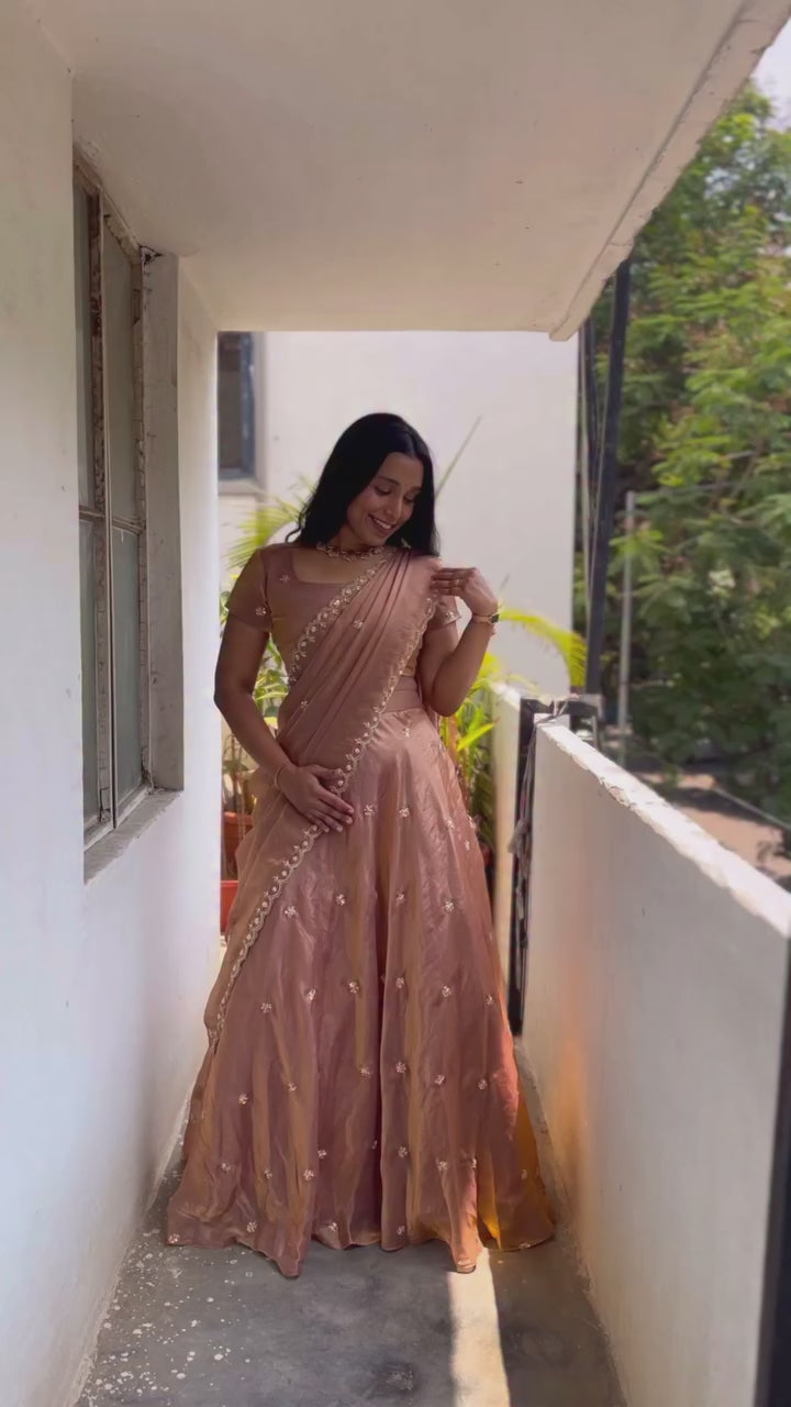 π Stand out with the subtle luxury of Copper. Shop this stunning Space Silk Half Saree only on Luxury Shukra β while stock lasts!