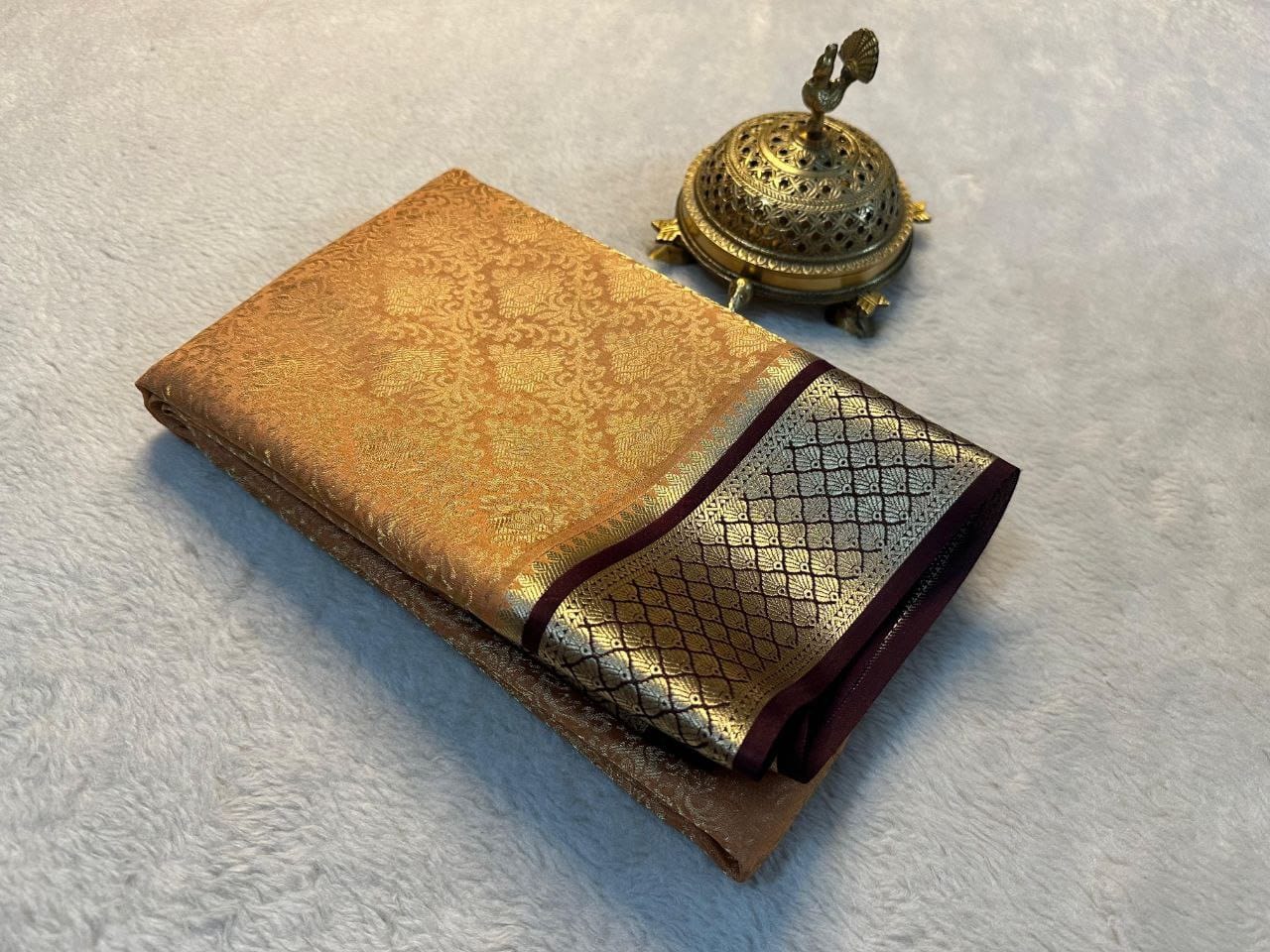 Exclusive Golden Mysore Silk Saree with Maroon Border & Rich Zari Weaving