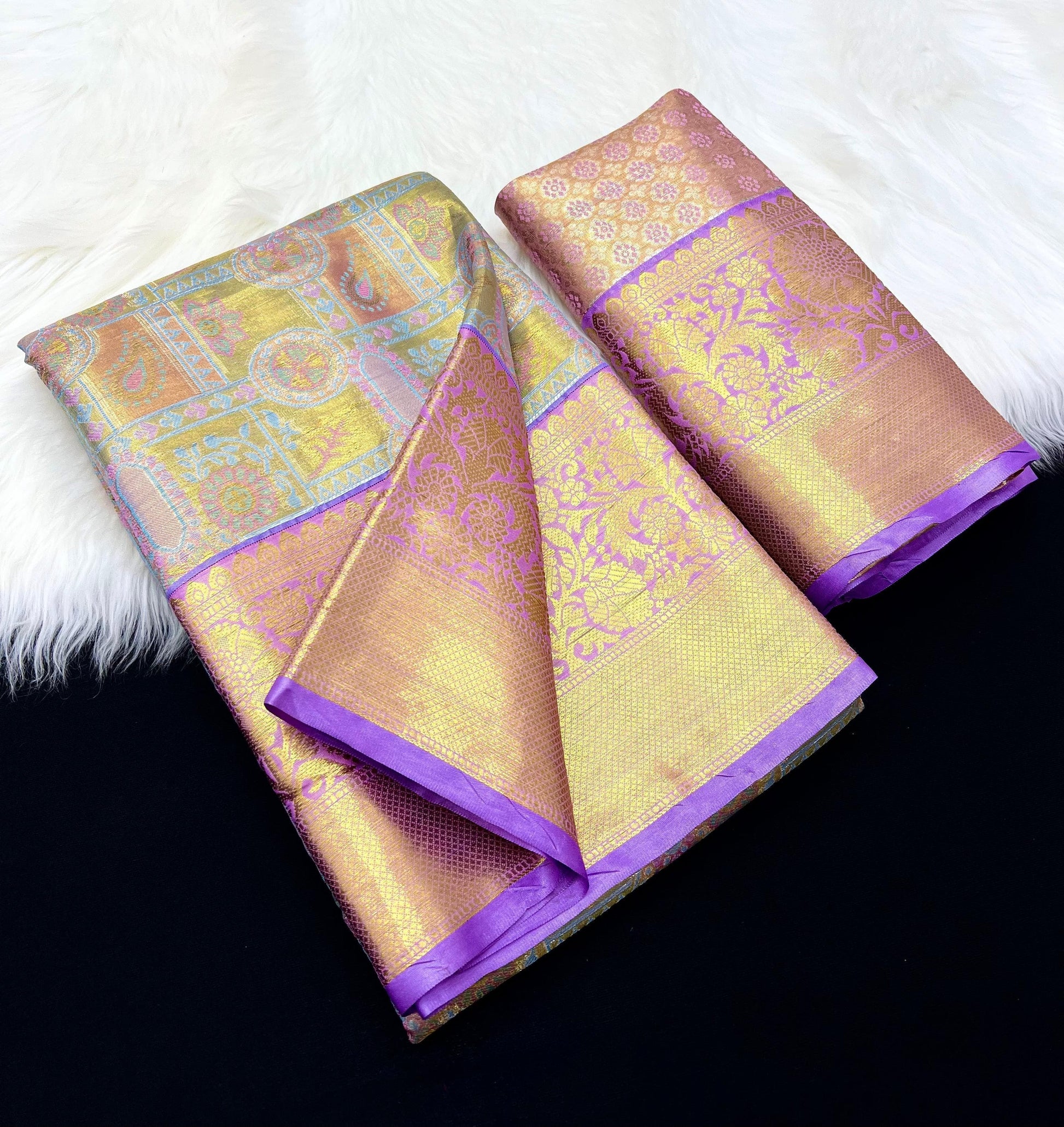Premium Lavender Gold Dual-Tone Kanjivaram Silk Saree with Brocade Blouse