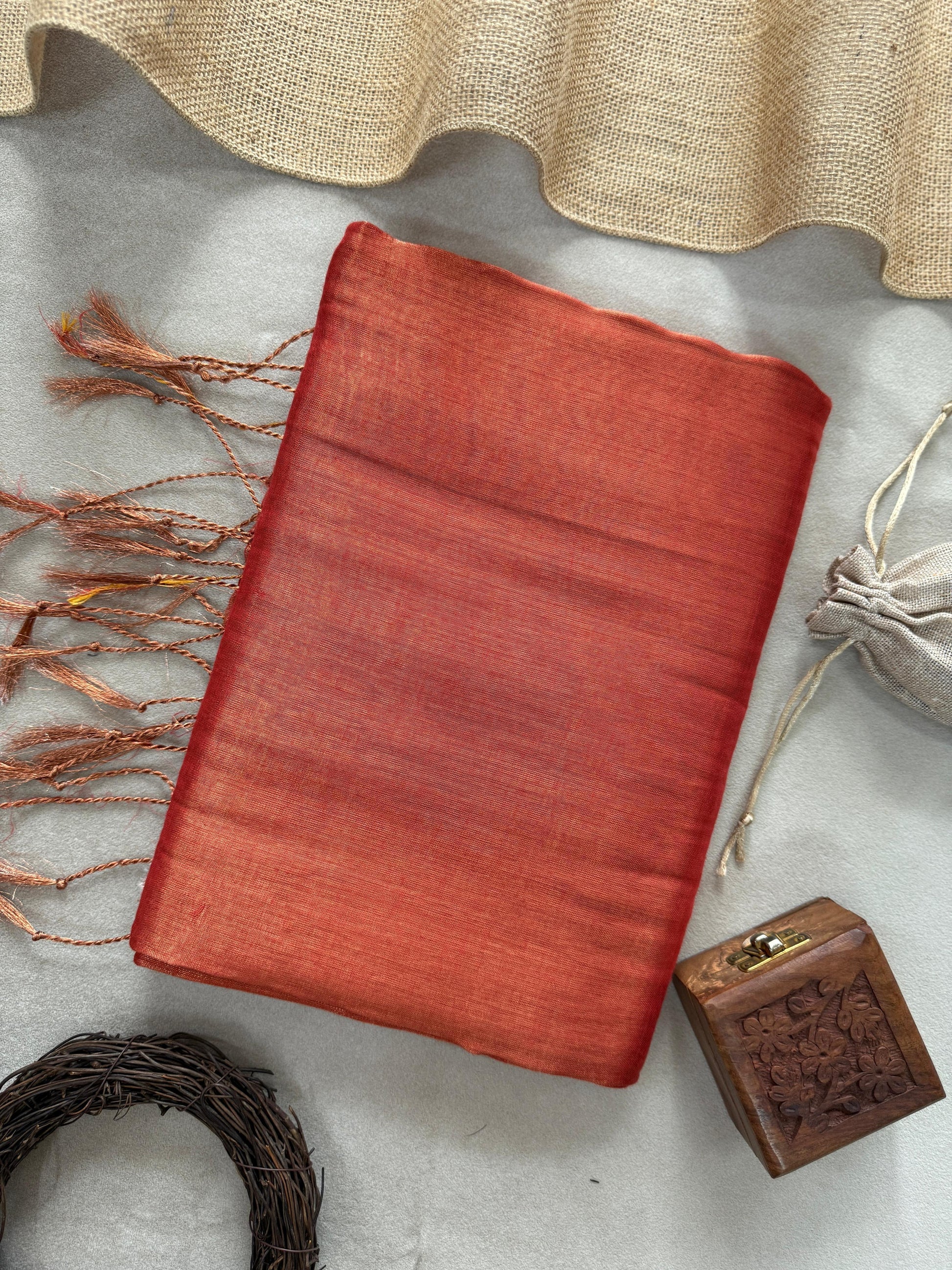 Bring warmth and energy to your festive wardrobe with this gorgeous orange tissue cotton saree. Made from lightweight tissue cotton, this saree offers a soft, airy drape with a natural sheen that enhances its vibrant hue. The pallu is adorned with stylish tassels, and a matching running blouse piece is included to complete your traditional or semi-formal look. Perfect for Navratri, cultural events, or daytime festivities.