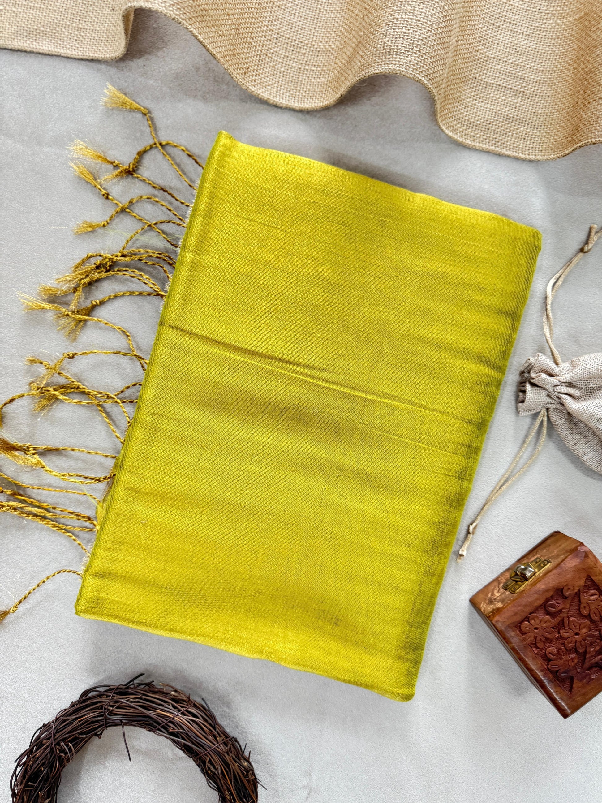 Brighten your ethnic collection with this vibrant yellow tissue cotton saree, perfect for festive mornings and cultural events. The lightweight fabric ensures all-day comfort, while the glossy texture adds a graceful shine. The saree features elegant tassels on the pallu and includes a matching running blouse piece for a complete traditional look. Ideal for haldi functions, pujas, or sunny day gatherings.